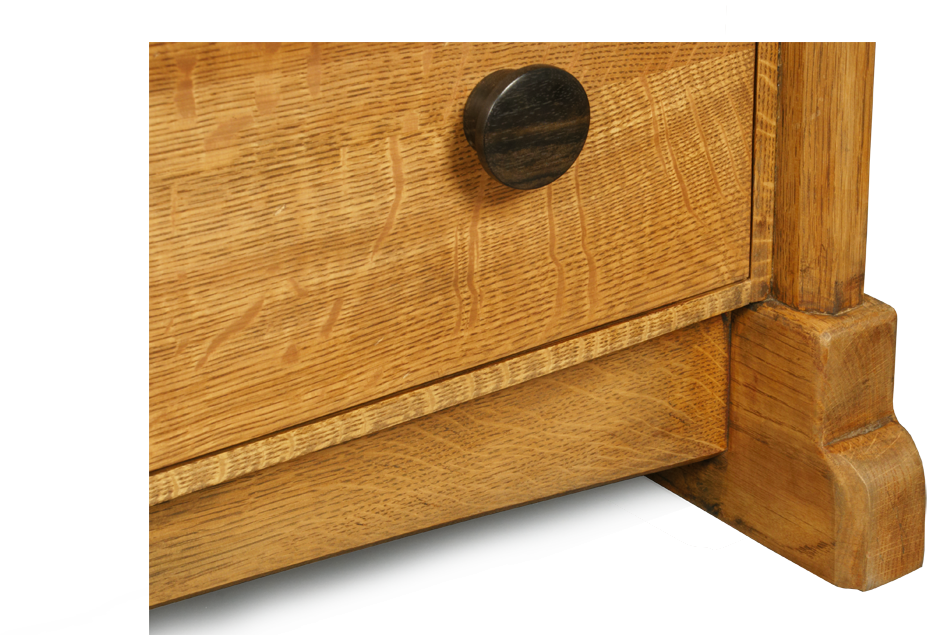 Handcrafted in quarter sawn American white oak with ebony inlay and ebony knobs.